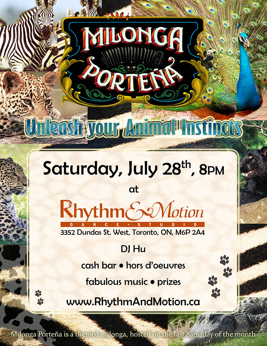 Saturday, Jul 28, 2018, 8:00 pm - 1:00 am Milonga Portena – Animal Instincts Rhythm & Motion Dance Studio 3352 Dundas St West, Toronto, Ontario $15