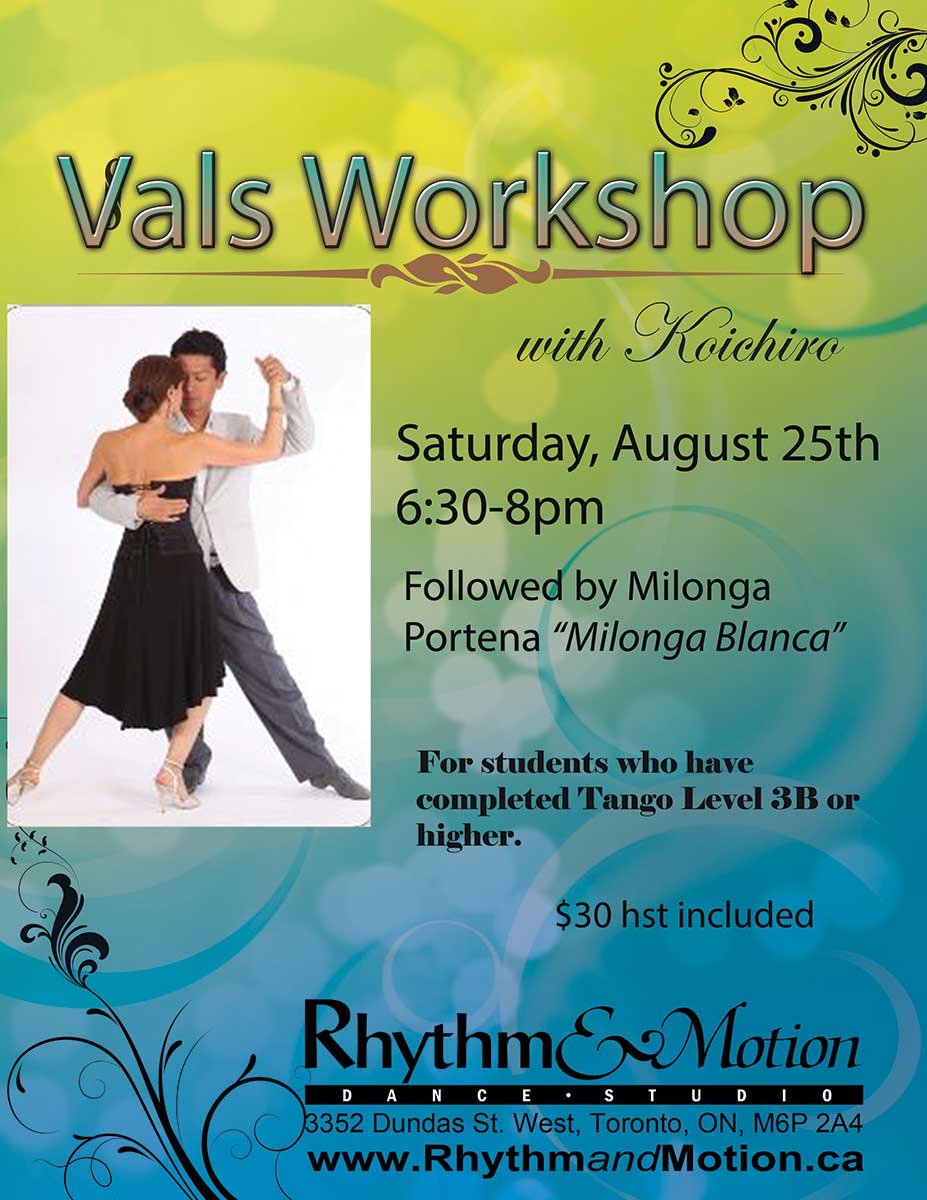 Saturday, Aug 25, 2018, 6:30 am - 8:00 pm Vals workshop with Koichiro Rhythm & Motion Dance Studio 3352 Dundas St West, Toronto, Ontario $30