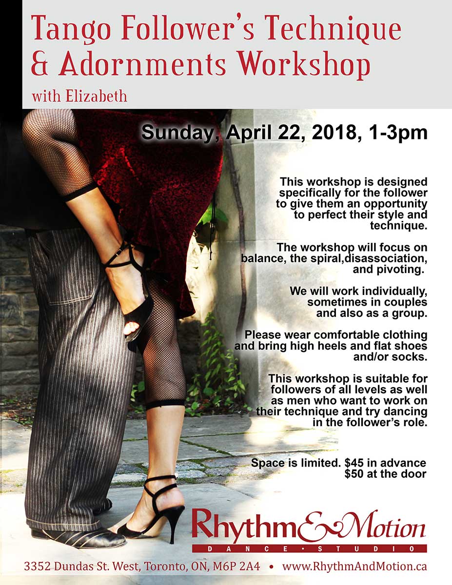 Sunday, Apr 22, 2018, 1:00 pm - 3:00 pm Followers Technique with Elizabeth Rhythm & Motion Dance Studio 3352 Dundas St West, Toronto, Ontario $50