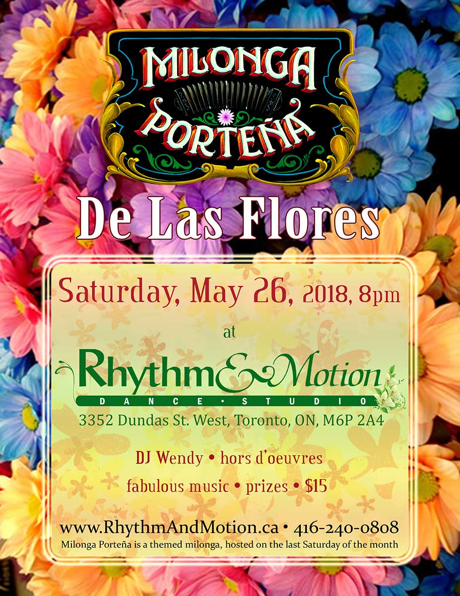 Saturday, May 26, 2018, 8:00 pm - 1:00 am Milonga Portena – De Las Flores Rhythm & Motion Dance Studio 3352 Dundas St West, Toronto, Ontario May 26, 2018 $15
