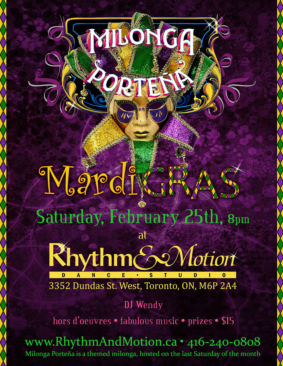 Rhythm & Motion Dance Studio 3352 Dundas St West, Toronto, OntarioMilonga Portena – Mardi Gras